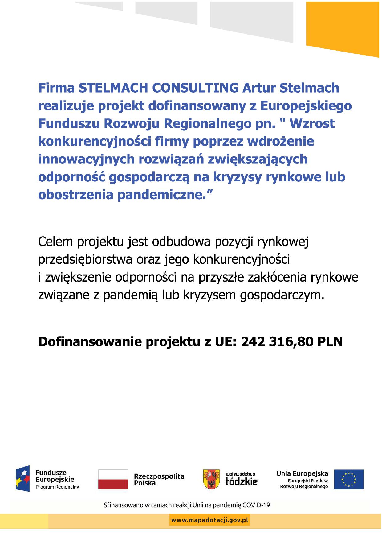 Projekt pn.: Wzrost konkurencyjności firmy poprzez wdrożenie innowacyjnych rozwiązań zwiększających odporność gospodarczą na kryzysy rynkowe lub obostrzenia pandemiczne, dofinansowany ze środków EFRR w ramach Regionalnego Programu Operacyjnego Województwa Łódzkiego na lata 2014-2020, XIII Osi priorytetowej REACT-EU dla Łódzkiego Działanie XIII.1 REACT-EU dla przedsiębiorstw TYP 1 - Wsparcie MŚP negatywnie dotkniętych skutkami epidemii COVID-19